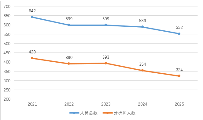 聯(lián)合資信倡導以人為本的企業(yè)文化,吸引了大批有識之士的加盟,近5年來,公司人員數(shù)量穩(wěn)定發(fā)展。截止2025年底,公司擁有分析師324人,占公司總?cè)藬?shù)的59%。