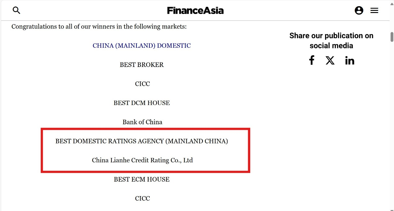 2025年4月16日,《亞洲金融》(FinanceAsia)雜志公布了2025年第29屆年度大獎(jiǎng)評(píng)選結(jié)果。聯(lián)合資信評(píng)估股份有限公司(以下簡(jiǎn)稱“聯(lián)合資信”)榮獲“中國(guó)大陸最佳評(píng)級(jí)機(jī)構(gòu)”(Best Domestic Ratings Agency – China Mainland)稱號(hào)。該獎(jiǎng)項(xiàng)表彰過(guò)去一年大陸地區(qū)綜合表現(xiàn)優(yōu)異的評(píng)級(jí)機(jī)構(gòu),體現(xiàn)了國(guó)際權(quán)威媒體對(duì)聯(lián)合資信的公信力、市場(chǎng)地位、業(yè)務(wù)能力、研究能力和投資人服務(wù)情況的高度認(rèn)可。